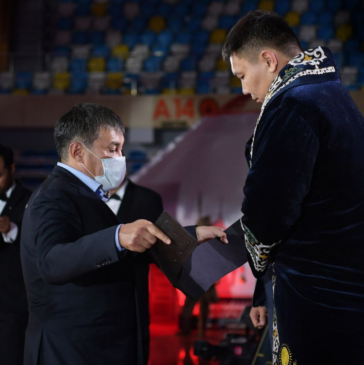 За победу Нуралинов получил 25 миллионов тенге призовых, золотой пояс и переходной "Тайтуяк" - слиток золота в виде копыта. Награду победителю вручил первый вице-президент Ассоциации Qazaq kuresi Самат Абиш.