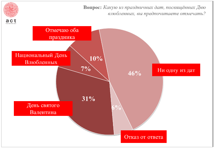 При этом 46 процентов респондентов обычно не отмечают ни День святого Валентина, ни национальный День влюбленных в Казахстане. Треть опрошенных отмечают День святого Валентина, 7 процентов - национальный День влюбленных в Казахстане, а 10 процентов респондентов отмечают обе праздничные даты.