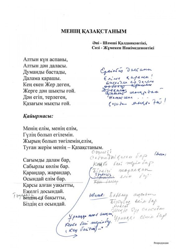 Кроме того, Акорда представила текст Гимна с правками Назарбаева.