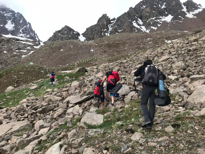 6 июля в 17:30 группа начала пешую часть маршрута с Талгарского перевала (3 200 метров). С перевала путешественникам открывается невероятный вид на Заилийский Алатау. С этой высоты виден и сам город Алматы.