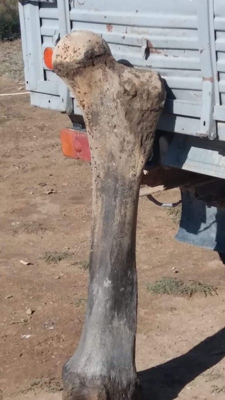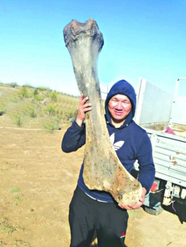 Әлеуметтік желілерде қолына беймәлім жануардың жілік сүйегіне ұқсас зат ұстап тұрған адамның суреті жарияланды. Атырау облысы Индер ауданы әкімдігінің баспасөз қызметінің мәліметінше, алып жануардың сүйегіне ұқсайтын жәдігер 25 қыркүйекте Есбол ауылы, Қайсағали учаскесі Жайық өзенінің жағасынан табылған.