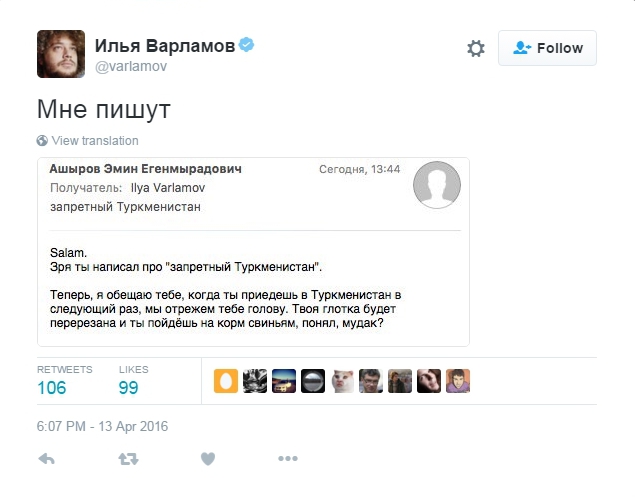 "Салям. Зря ты написал про "запретный Туркменистан". Теперь я обещаю тебе, когда ты приедешь в Туркменистан в следующий раз, мы отрежем тебе голову. Твоя глотка будет перерезана и ты пойдешь на корм свиньям", - говорится в послании, которое Варламов опубликовал в своем Twitter.