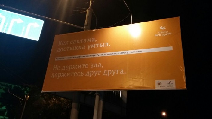 Как стало известно, они появились в рамках городского социального проекта "Алматы Жеті Жарғы" - семь правил для комфортной жизни. Авторы правил вдохновились историческим документом XVII века "Жеті Жарғы", созданным ханом Тауке вместе с биями трех жузов - Толе би, Казыбек би и Айтеке би. "Когда ты в пробке, ты не один. Мы вместе", "У нас не ходят хмурыми. У нас ходят в горы", "Не держите зла, держитесь друг друга", "Не смотри свысока, смотри как красиво" - вот некоторые из правил алматинского Жеті Жарғы.