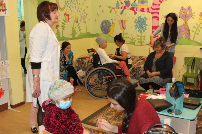 "Когда к нам в отделение поступает ребенок, мы сразу же получаем двух пациентов - это ребенок и его мама. Причем с ребенком всегда легче найти общий язык, нежели с мамой. Потому что женщины поступают, как правило, в состоянии очень глубокой депрессии. Хотя мы и пытаемся донести, что у нас очень хорошие результаты лечения, что они должны быть готовы к выздоровлению. Но узнать диагноз - это уже стресс. Поэтому мамы находятся у нас в плачевном состоянии. С ними работают психологи, и мы за столько лет работы сами стали психологами. Мы уже чувствуем, к какой маме какой подход нужен. И хотим хотя бы на 10-15 минут отвлечь их от этого", - рассказывает заведующая детским отделением КазНИИОиР Анна Быковская.