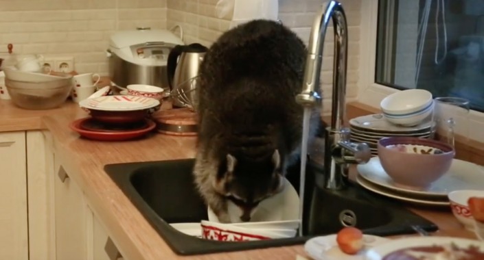 Енота сняли на видео за мытьем посуды в Алматы