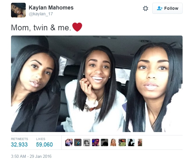 Старшеклассница из американского города Индианаполис Кейлан Махомс озадачила Интернет семейным снимком, который она опубликовала на своей странице в Twitter. "Мама, близняшка и я", - подписала фотографию 16-летняя девушка.