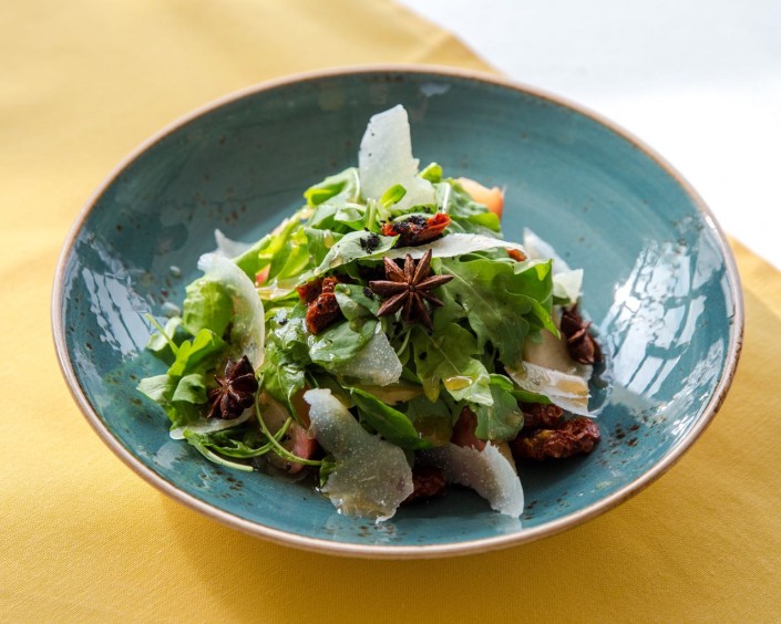 На одну порцию салата понадобится: 25 граммов руколы, 20 граммов вяленых томатов, 120 граммов яблок, приготовленных по технологии су-вид с бадьяном и палочками корицы, 15 граммов сыра пекарино с черным трюфелем, 100 миллилитров яблочного фреша, 40 граммов меда, 5 граммов корня имбиря. Рецепт таков. Рукола промывается и обсушивается. Яблоки, бадьян, палочки корицы  вакуумируются и варятся при температуре 80°C в течение 20 минут, после - остужаются в ледяной воде. В яблочный фреш добавляется корень имбиря, варится на медленном огне в течение 20-25 минут, добавляется мед и вываривается до состояния соуса, охлаждается. Выкладываются яблоки, рукола, вяленые томаты и поливаются соусом. Сверху тонкими слайсами натирается сыр пекарино.