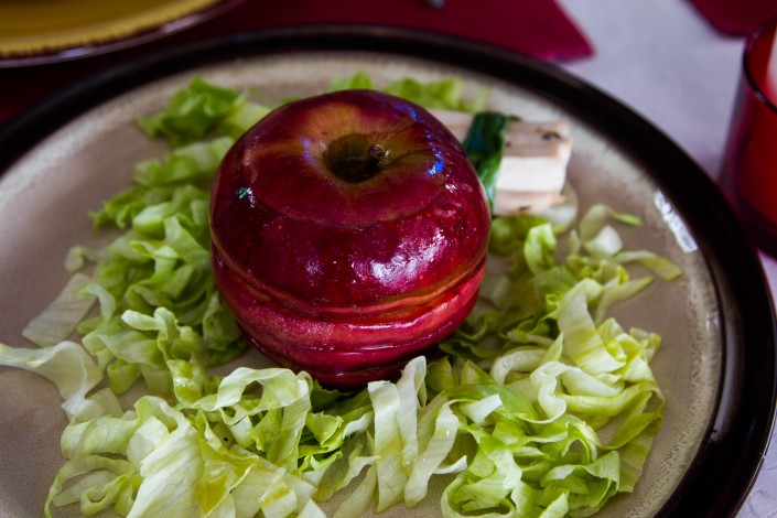 Салат "Кызыл алма". Яблочные кольца обжариваются на сливочном масле, начиняются запеченной свеклой, подаются с дижонской горчицей и соусом, приготовленным из жирных сливок, слабосоленого лосося и каперсов.