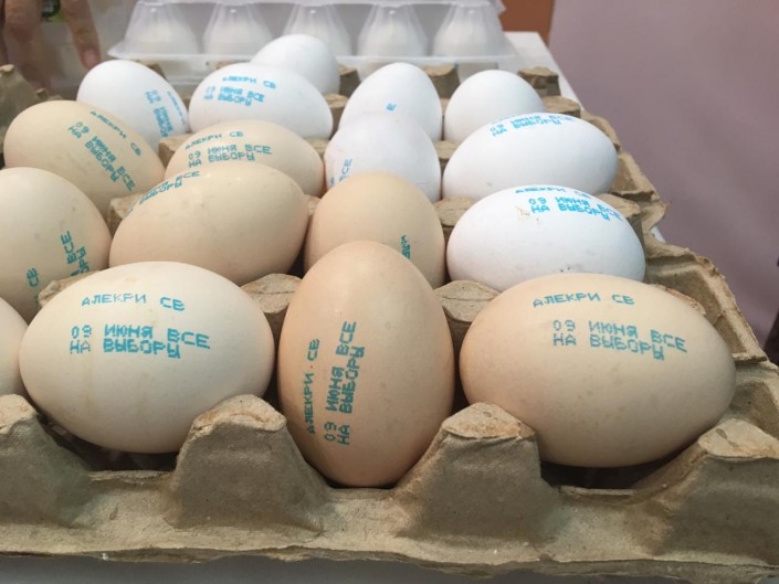 На сельскохозяйственной выставке-ярмарке в здании Мажилиса в рамках парламентских слушаний выставили на продажу яйца из Северо-Казахстанской области с надписью "9 июня все на выборы", передает корреспондент Tengrinews.kz.