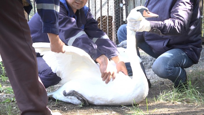 По словам Валерии, лебеди находились в 200 метрах от водоема бывшей шахты "6-7". Подойти к воде, видимо, не могли. На место, указанное девушкой, выехали сотрудники областной территориальной инспекции лесного хозяйства и животного мира и ветеринарная группа карагандинского зоопарка. Они отловили живую птицу и транспортировали в зверинец. Там птицу осмотрели специалисты. Поместили в вольер, соседний с белым павлином.