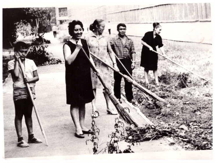 Женщины в скромных платьях и с красивыми улыбками, мужчина в рубашке с закатанными рукавами и задумчивый мальчик по имени Тимур в коротеньких шортах. Ему всего восемь, но он занят важным делом: помогает маме убираться возле легендарной ковровой фабрики. Вокруг те самые деревья, что будут почти полвека радовать алматинцев своими раскидистыми ветками, а потом погибнут под топорами варваров, руководствующихся непонятно чем.