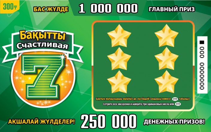 "Лотерейный билет "Бақытты 7" будет стоить 300 тенге - по нему можно выиграть максимум один миллион тенге. Стоимость лотерейного билета "Алтын" составляет 500 тенге, максимальная сумма моментального выигрыша - два миллиона тенге. Общий тираж лотереи - два миллиона сто тысяч билетов, из которых свыше 450 тысяч билетов являются выигрышными. Призы до 100 тысяч тенге можно будет получить на месте покупки билета - в официальных точках продаж. Хотелось бы предупредить, что согласно Налоговому кодексу РК выигрыши по лотерее, составляющие более 50 процентов от минимального размера заработной платы, или свыше 12 тысяч тенге, подлежат налогообложению", - рассказал пиар-директор компании "Сәтті Жұлдыз" Нуркен Халыкберген.