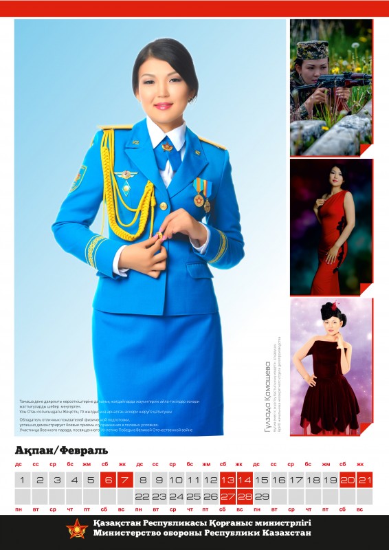Календарь, составленный по итогам конкурса красоты среди сотрудниц Министерства обороны "Батыр Арулар", опубликован тиражом в тысячу экземпляров. О том, что каждая из 12 финалисток украсит страницы определенного месяца специализированного календаря на 2016 год, было объявлено сразу после старта конкурсного интернет-голосования.