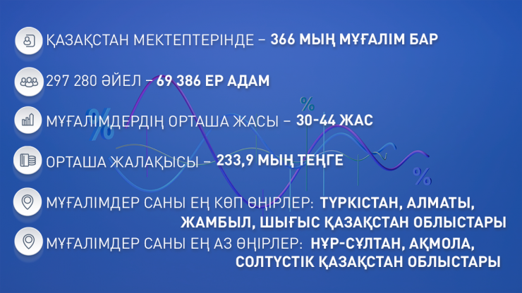 Республика бойынша мұғалімдер саны ең көп төрт өңір мынадай: Түркістан облысы - 58 574, Алматы облысы - 44 280, Жамбыл облысы - 27 438, Шығыс Қазақстан облысы - 24 187.