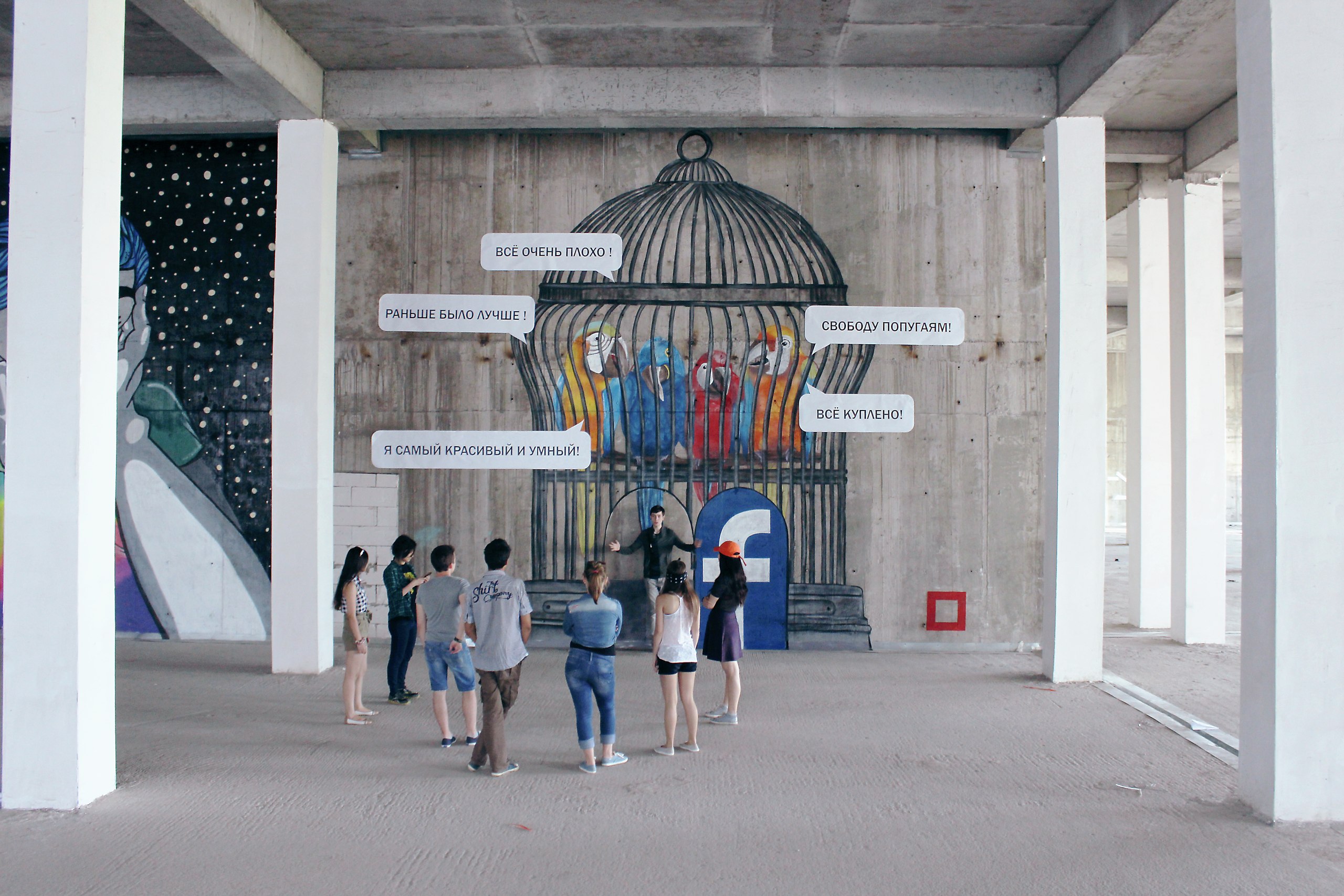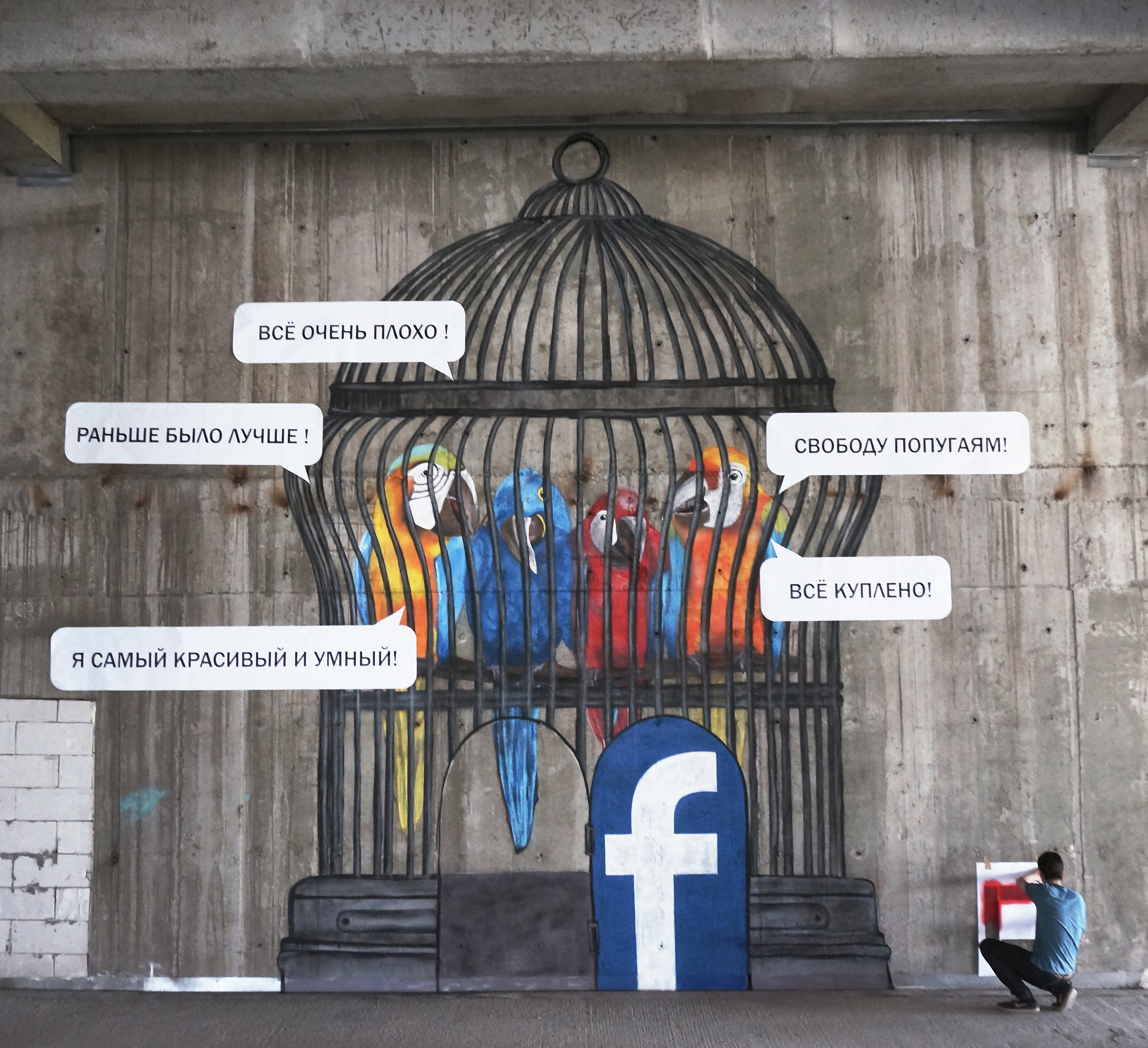 По словам молодого стрит-арт-художника, сегодня в Сети огромное количество пользователей-провокаторов, которые могут лишь критиковать. "Было бы только замечательно, если бы люди размышляли, анализировали, а не просто ставили "лайк". Или бы появились эксперты, аналитики. Но этого нет. Им на смену пришли анонимы, которые каждый день исправно распространяют перевернутую информацию и выдают это за правду. Такая вот идея появилась - сравнить этих блогеров с попугаями в открытой клетке", - считает он.