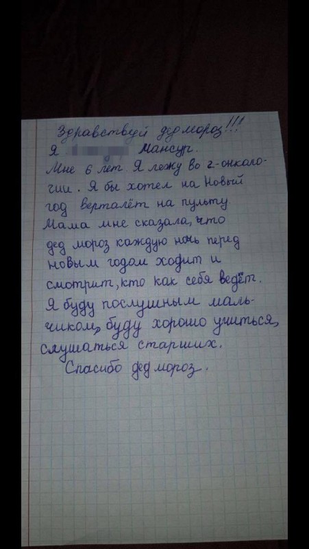 Большая партия писем пришла из отделения детской онкологии. Шестилетний мальчик Мансур попросил вертолет, который управляется с помощью пульта.