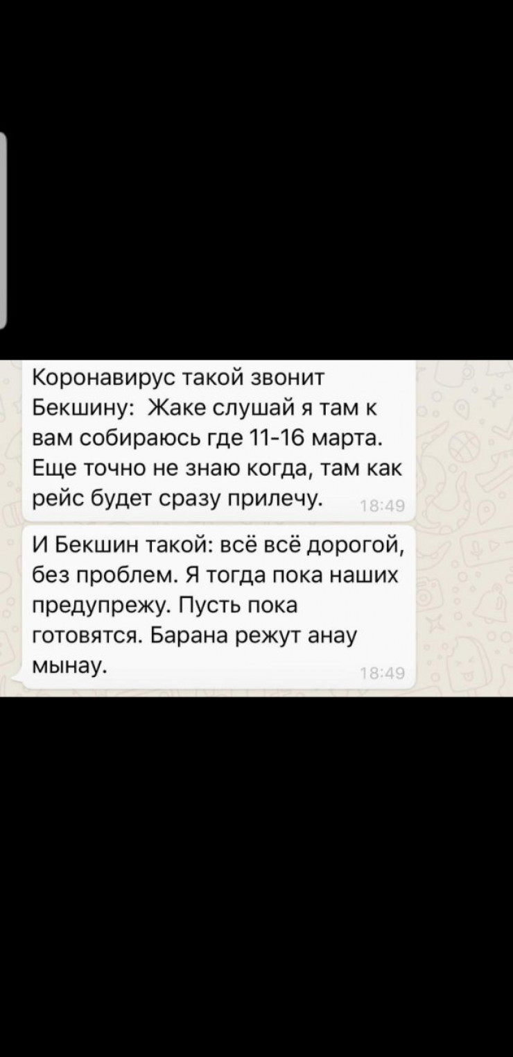 "По нашему прогнозу, где-то с 11-16-го у нас должен быть, все же наконец-то появится коронавирус в стране. Но это прогноз. Плюс-минус одна неделя… Как только у нас появится коронавирус, мы сразу введем специальные мероприятия", - сказал Бекшин.