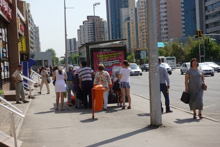 Сложнее в эти часы людям, ожидающим автобусы на остановках. Им приходится в буквальном смысле ловить тень.