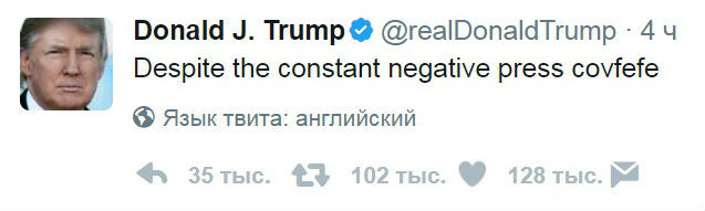 "Несмотря на постоянную негативную covfefe в прессе", - написал Трамп в ночь на 31 мая. Запись так и осталась незаконченной. В комментариях всю ночью обсуждали версии, что могло случиться с Трампом.