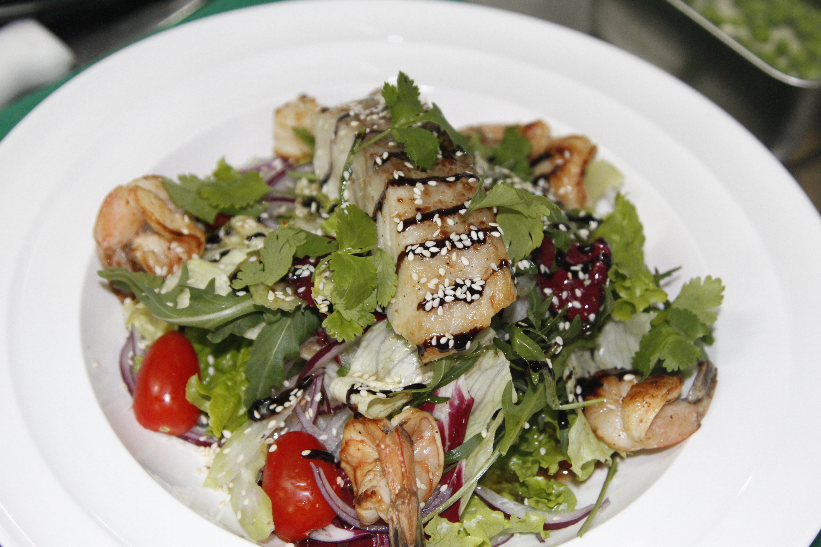 3. Теплый салат с треской и креветками. Вам потребуется 80 граммов листьев салата руккола, радичио и зеленого салата, а также по 20 граммов красного лука и стебля сельдерея. 180 граммов филе трески необходимо запекать в духовке 15 минут при температуре 180 градусов. Креветки обжарить в белом вине со специями. К этому добавить специальный соус, состоящий на 1/3 из соевого соуса и на 2/3 из оливкового масла, чеснока и острого перца. Блюдо украсить помидорами черри.