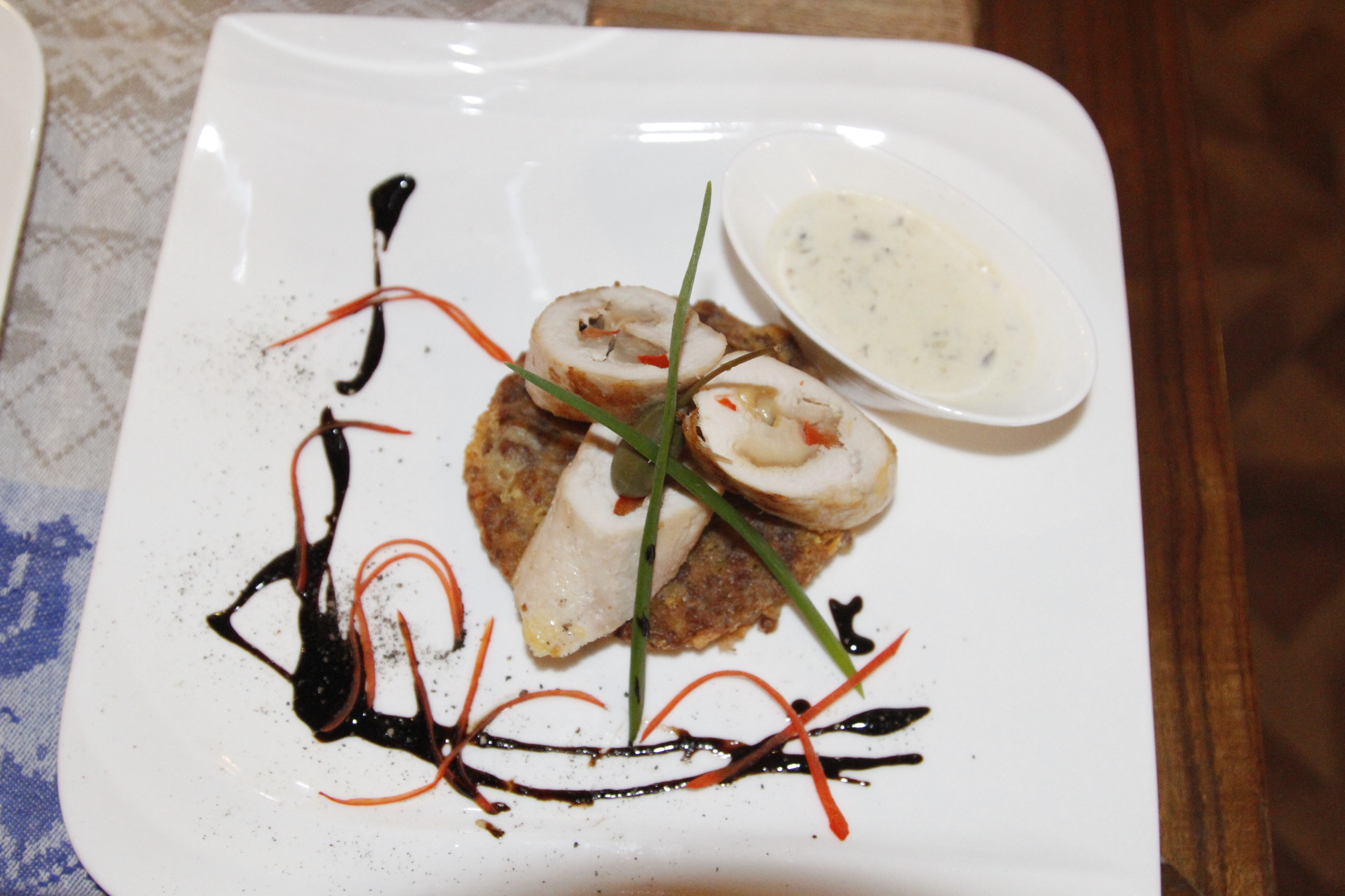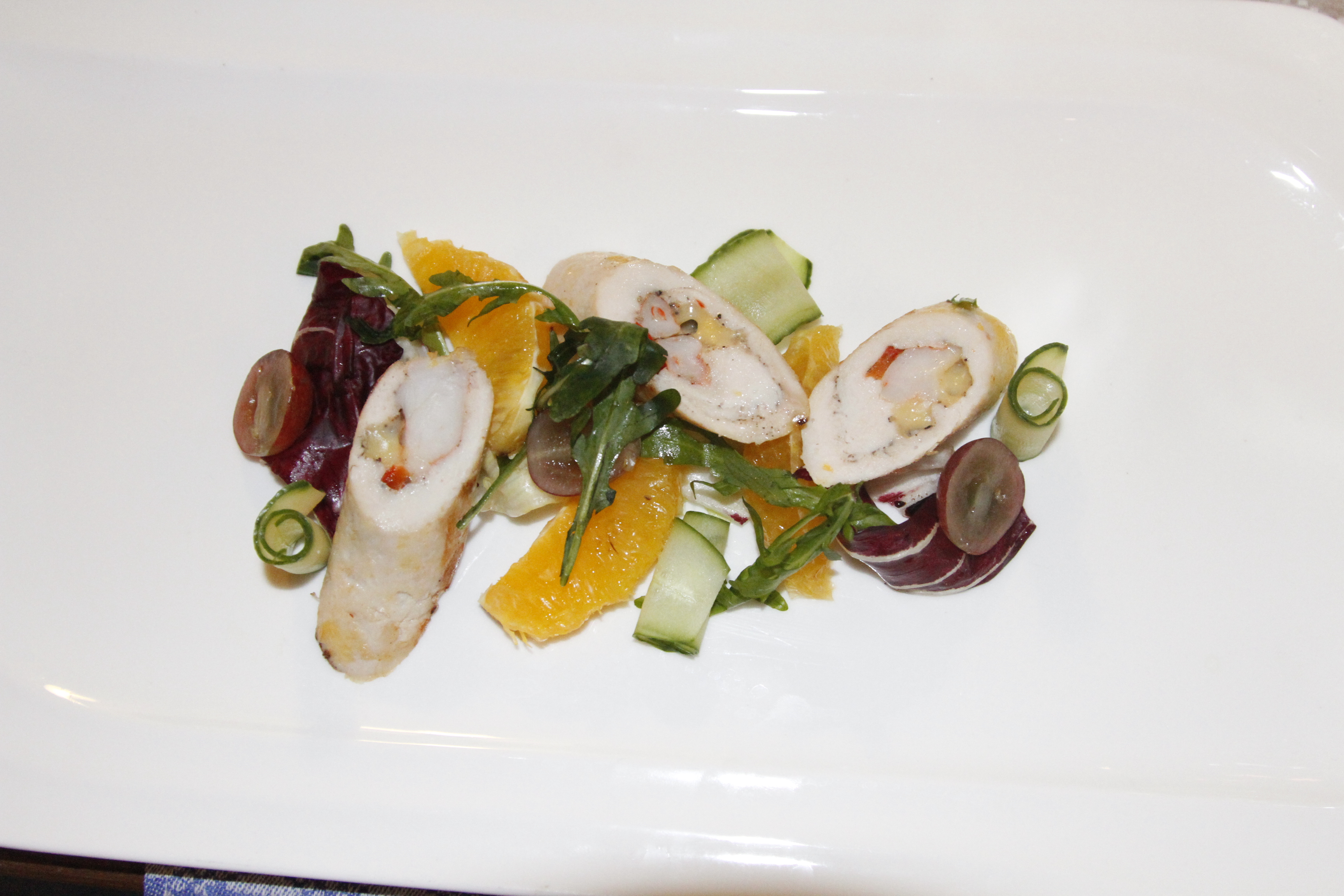 6. Куриный рулет с креветкой. Принцип приготовления этого блюда не отличается от предыдущего. Здесь вместо грибов в куриный рулет необходимо положить 20 граммов сыра (его выбираем на свой вкус) и одну большую или несколько маленьких не обжаренных креветок. К гарниру повар советуют подать виноград, апельсин, несколько листьев салата и ломтики огурца.