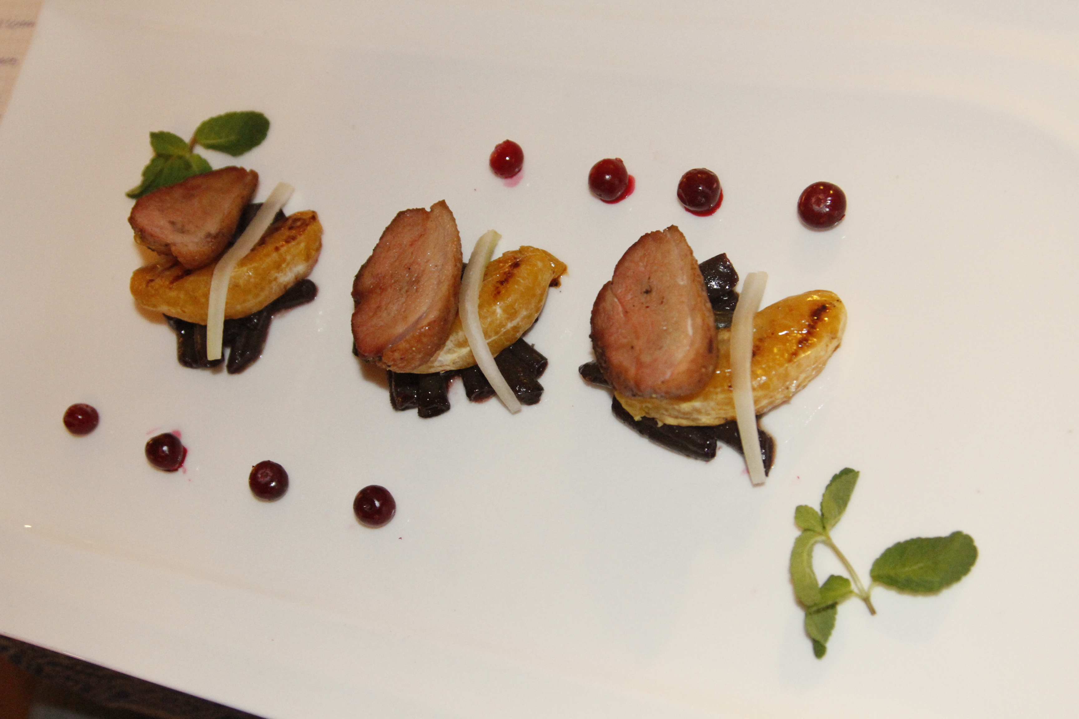 4. Утиная грудка под апельсиновым маринадом. Вам потребуется 150 граммов утиного филе. Мясо необходимо замариновать с солью и перцем за несколько минут до того, как поставить в духовку. Далее грудку надо запекать 7 минут при температуре 180 градусов. 150 граммов стручковой фасоли обжарить на масле, затем туда же, в сковороду, добавить вино, сахарный сироп и апельсиновый сок. После того, как жидкость выпарится, фасоль подать в качестве гарнира для утиной грудки. Дополнением к гарниру послужат дольки апельсина, обжаренные на гриле или сковородке. Украсить блюдо повар предлагает ягодками клюквы и мятой.