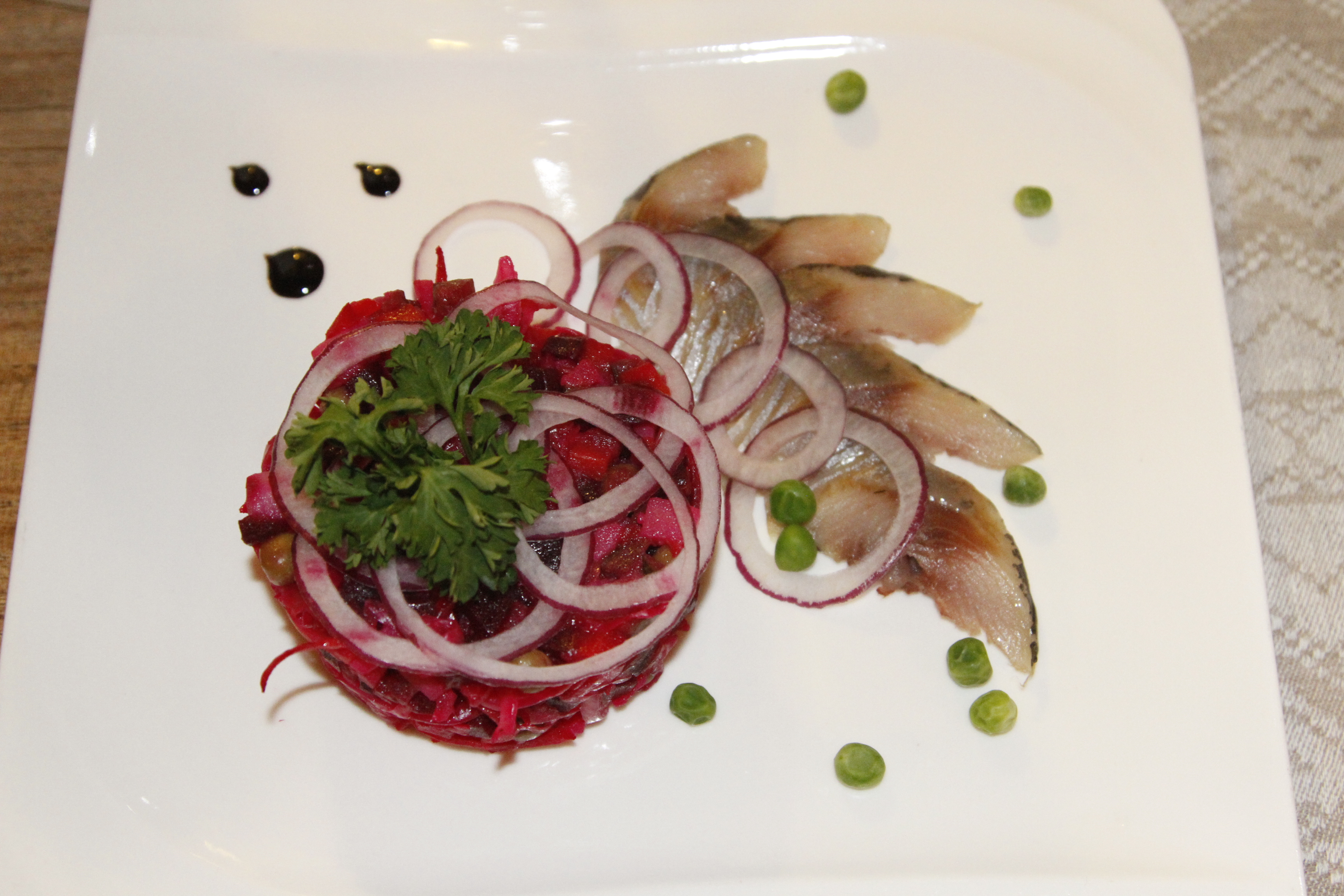 2. Винегрет с малосольной сельдью. Вам потребуется 40 граммов отварного картофеля, столько же бочковых соленых огурцов, по 30 граммов отварной моркови и зеленого горошка, а также по 50 граммов квашеной капусты (с репчатым луком и растительным маслом) и отварной свеклы. Повар советует вначале перемешать свеклу и квашеную капусту - так блюдо будет иметь насыщенный цвет. Малосольную сельдь нарезать тонкими ломтиками и уложить рядом с салатом. Сверху блюдо украсить тонким колечками красного лука и петрушкой.