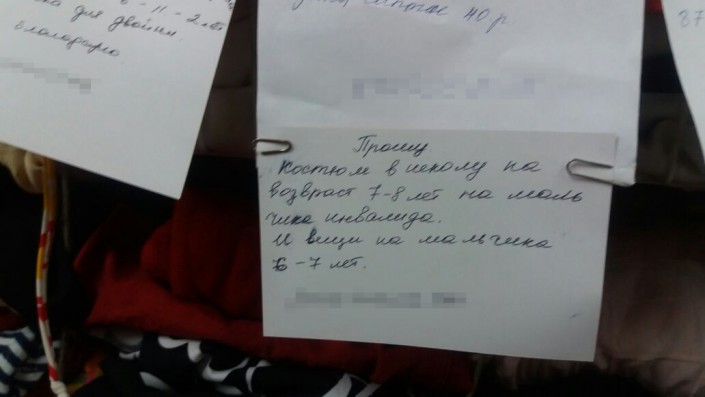 По ее словам, через пару дней куртку принесли в магазин и попросили передать автору объявления. Но к этому времени рядом с первой запиской появилась вторая. "Нужна детская кроватка и вещи на ребенка шести месяцев. Будем рады памперсам".