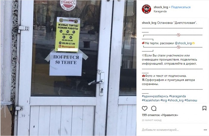 Курьезная ситуация описывается на странице shock_krg в Instagram. Помещение, о котором идет речь, расположено в центре Караганды, недалеко от остановки "Диетстоловая".