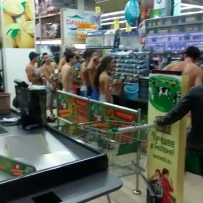 "Действительно у нас проводится акция. Первый забег был две недели назад. Сегодня мы провели повторный забег. Условия акции - девушки должны придти в купальниках, а парни в купальных шортах. Однако появляться в магазине в нижнем белье - категорически запрещено правилами. Они переодеваются у нас в гардеробной и проходят регистрацию на первом этаже гипермаркета", - рассказала менеджер торговой сети Юлия Кан, добавив, что другие покупатели отнеслись к акции положительно.