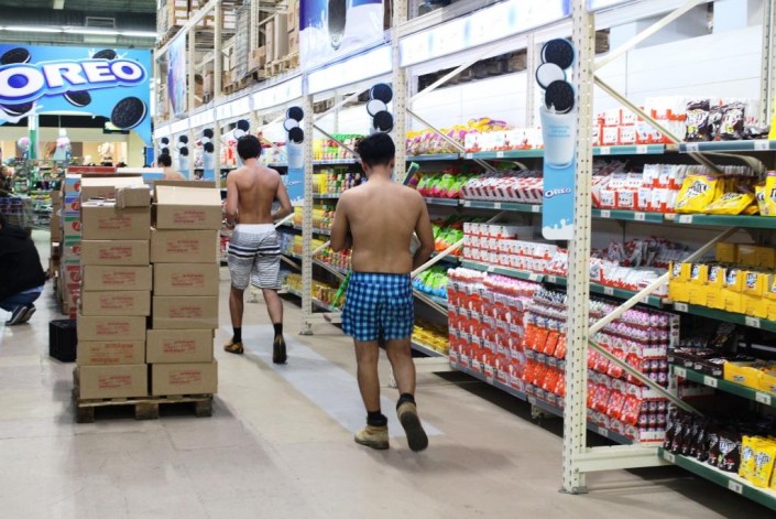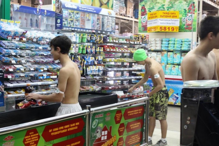 Необычные покупатели были замечены в одном из гипермаркетов Алматы, передает корреспондент Tengrinews.kz. Всеобщее внимание они привлекли благодаря тому, что были одеты, мягко говоря, не по погоде. Группа молодых людей, с голыми торсами, расплачивалась на кассе, где и были засняты на фото очевидцами.