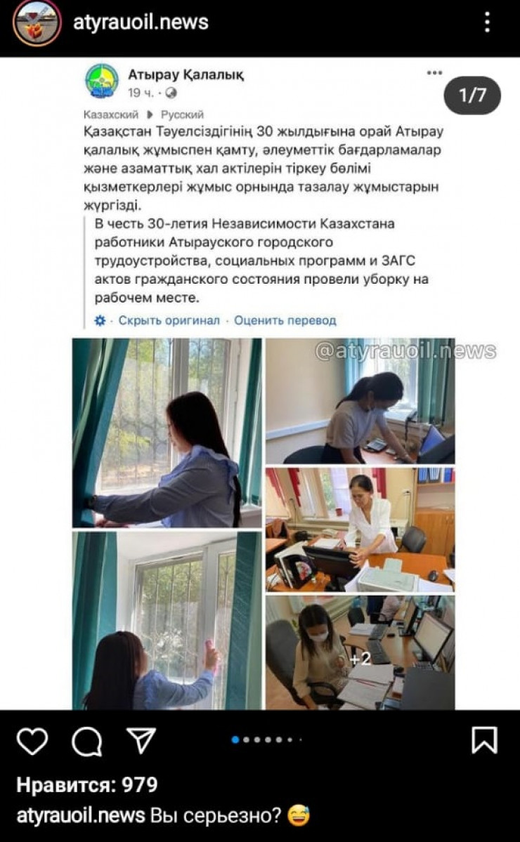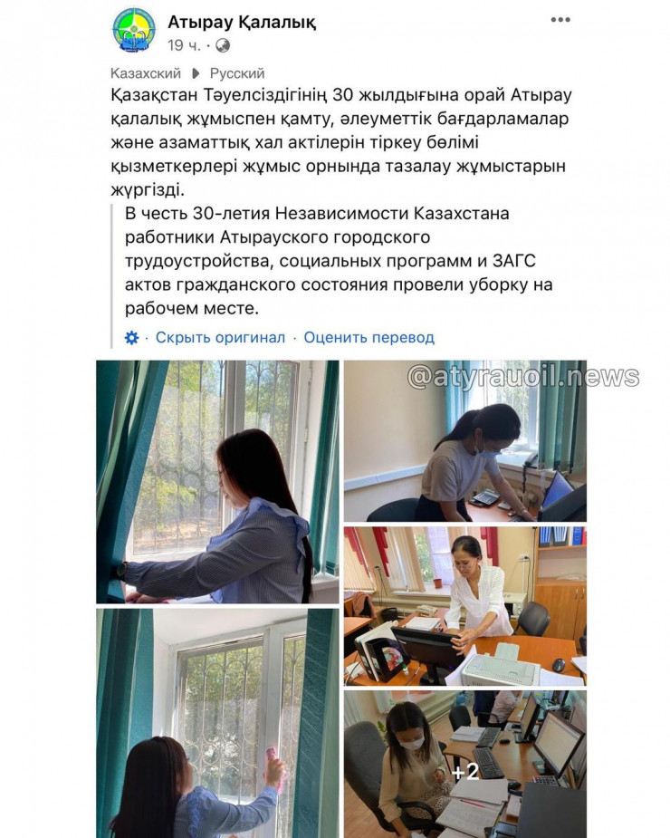 В социальных сетях бурно обсуждается мероприятие, проведенное атыраускими госслужащими. На официальной странице городского отдела занятости, социальных программ и РАГС опубликован пост об уборке сотрудников на рабочем месте в честь 30-летия независимости Казахстана. Скрины публикации быстро разошлись по пабликам в соцсетях, передает корреспондент Tengrinews.kz.