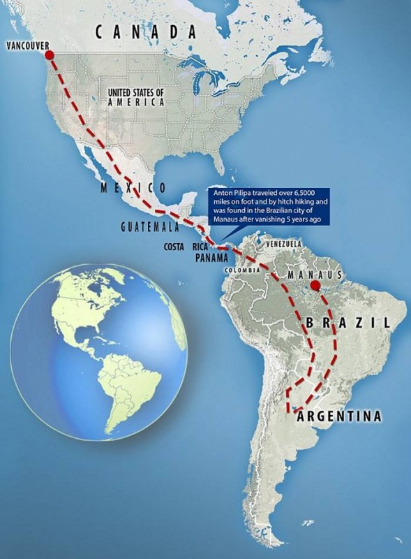 39-летний Антон Пилипа пересек два континента после того, как исчез из своего дома в Ванкувере в 2012 году. За пять лет Пилипа удалось побывать в США, Мексике, Гватемале, Коста-Рике, Панаме, Колумбии, Венесуэле, Аргентине и Бразилии.