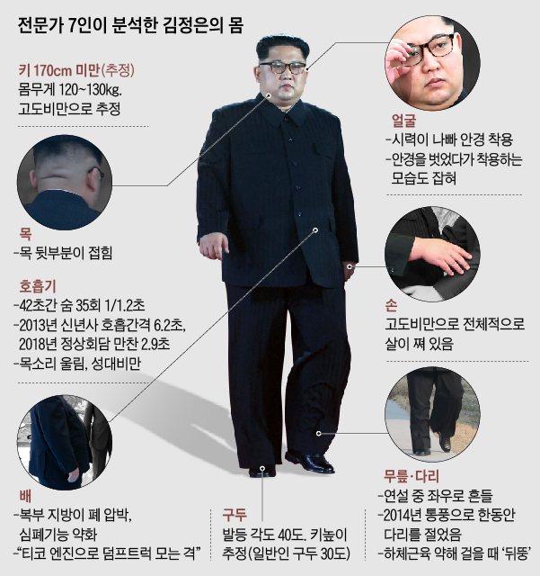 Эксперты также вычислили, что индекс массы тела Кима - 45 единиц, "нездорово высокий". "А когда он прохаживался, казалось, что у него затруднено дыхание, хотя эксперты сочли, что это могло быть от нервов", - пишет издание.