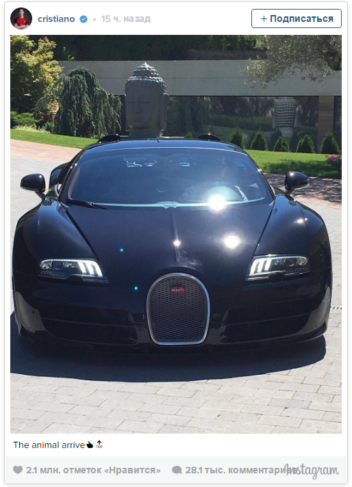 Стоимость нового Bugatti зависит от комплектации и года выпуска и стартует с 1,2 миллиона евро. Цена машины, купленной Роналду, неизвестна.