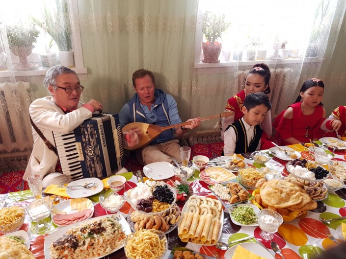 Глава семьи Сетимхан Аймаханов рассказал Джону Уоррену о казахских семейных традициях, о национальных инструментах. После вся семья исполнила для гостя песню.