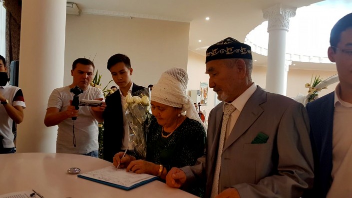 55-летие совместной жизни отпраздновала пара из Алматы. Изумрудную свадьбу 74-летний Келгенбай Жасапбергенов и 72-летняя Нургуль Кадыргулова провели в отреставрированном Дворце бракосочетания южной столицы, передает корреспондент Tengrinews.kz. Отметим, что это первая изумрудная свадьба, проведенная именно во Дворце бракосочетания Алматы. Пять лет назад пара отмечала золотую свадьбу - 50-летие совместной жизни.