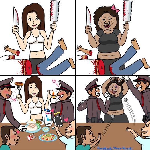 Инцидент спровоцировал общественный резонанс. Одна половина превратилась в фанатов сексуальных убийц, а другая - осуждает их. Чтобы описать сложившуюся ситуацию, японский художник Онан Хироши нарисовал комикс о двойственности общества.