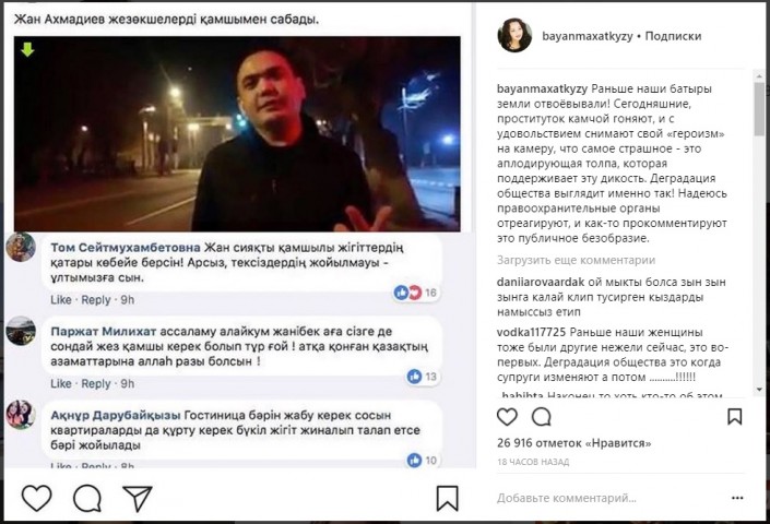"Бұрын батырларымыз жерді жаудан қорғаған! Бүгінгілер камшымен жезөкшені қуалап жүр, осы "батырлығын" рахаттана камераға түсіреді, қорқыныштысы - оның ісіне қолдау білдіріп, қошемет көрсеткен жұрт. Қоғамның кері кеткенінің айқын мысалы! Құқық қорғау органдары бұған бағасын беріп, қоғамдық шектен шыққан жағдайға қатысты пікір білдіреді деп үміттенемін", - дейді Алагөзова.