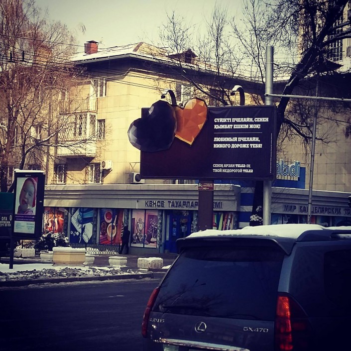 Баннеры с сердечками и поздравительными подписями "Любимый Пчелайн. Никого дороже тебя!" и "Любимый Кисель, никого дороже тебя!" появились на улицах Алматы.