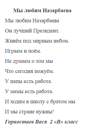 Напомним, стихотворение о Назарбаеве без рифмы удивило Казнет. Воспитаннику детского сада дали выучить стихотворение о Президенте Казахстана. Как выяснилось, такое задание родителям ребенка поручила молодой педагог одного из частных детских садов Алматы. "С объяснения руководителя частного детского сада молодая воспитательница взяла данное стихотворение в Интернете. Не согласовав ни с методистом, ни с кем, никому не показав, дала родителям ребенка, чтобы он выучил данное стихотворение", - рассказала руководитель отдела дошкольного воспитания алматинского Управления образования Алия Садиева.