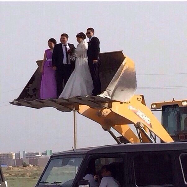 Фотография казахстанских молодоженов, появившаяся недавно в социальных сетях, стала предметом для шуток. На снимке, сделанном предположительно в Актау, жених и невеста вместе с дружкой и подругой сфотографировались в поднятом над землей ковше погрузчика.