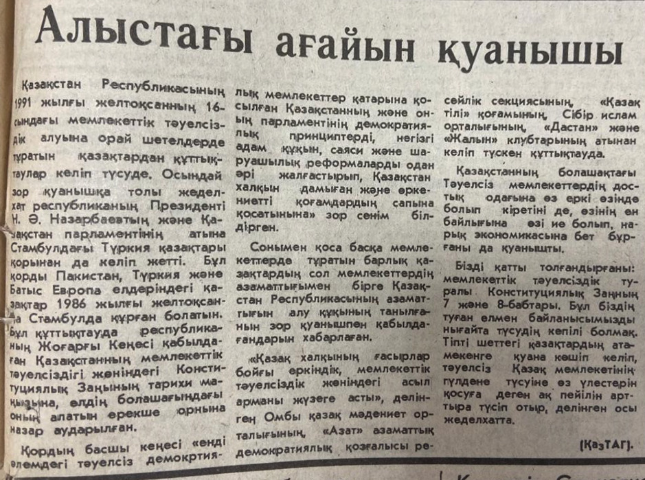 Еліміз тәуелсіздік алғаннан кейін алыс-жақын шетелдегі қазақтардың да қуанғаны сөзсіз. Бұл құттықтау жеделхаты Тұңғыш Президент Нұрсұлтан Назарбаевтың және Қазақстан парламентінің атына Стамбулдағы Түркия қазақтары қорынан келген екен.