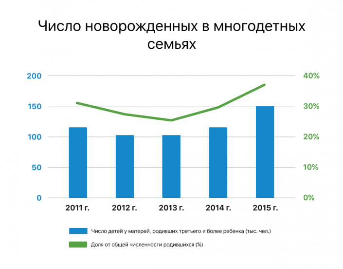 По результатам прошлого года почти 38 процентов новорожденных появились в семьях, где уже есть двое и более детей (для сравнения, в 2014 году - всего 29,3 процента).