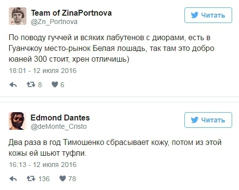 Выбор обуви Тимошенко вызвал массу возмущений и издевок среди пользователей социальных сетей. В частности, некоторые из них начали шутить, что туфли сделаны из кожи самой Тимошенко либо из кожи пенсионеров.