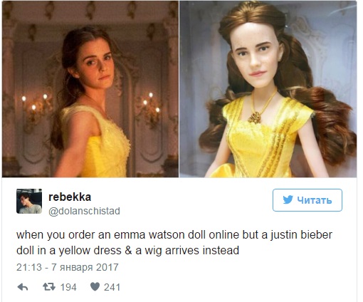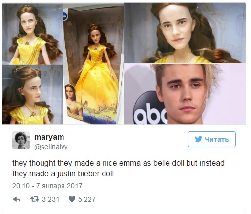 Снимок быстро распространился по социальным сетям, причем большинство людей сошлось во мнении, что кукла больше всего напоминает Джастина Бибера в бальном платье, а вот с прекрасной героиней "Красавицы и чудовища" сходства меньше.