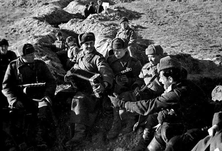 Западный фронт. Советские солдаты в часы досуга на передовой линии. 1942 год.