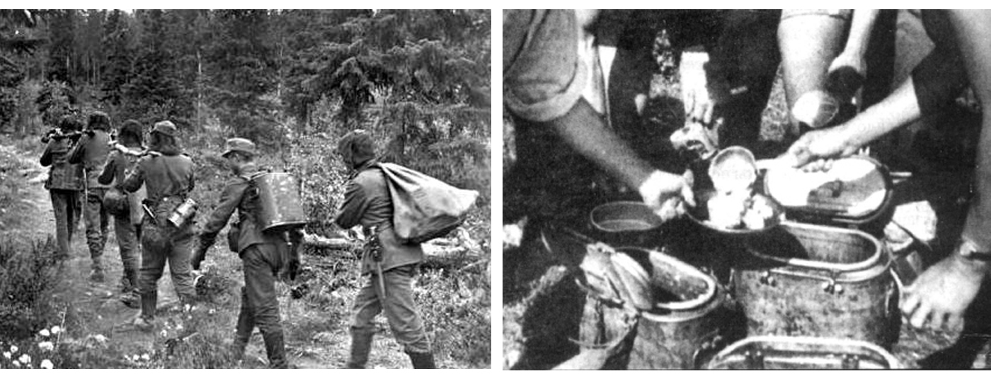 Для доставки пищи от полевой кухни на фашистскую передовую применялись большие контейнеры, снабженные заплечными ремнями. Они были двух видов: с большой круглой винтовой крышкой и с откидной крышкой размером по всему поперечному сечению контейнера. Первый тип предназначался для перевозки напитков (кофе, компоты, ром, шнапс и другое), второй - для таких блюд, как суп, каша, гуляш.