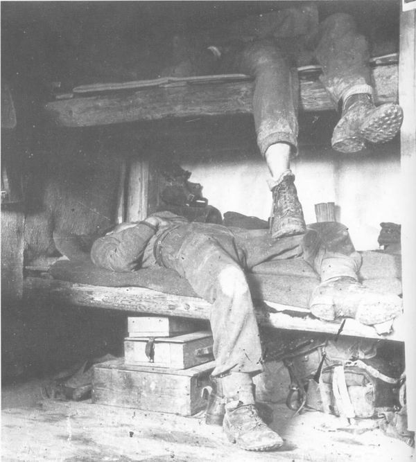 Из воспоминания бойца Ленинградского фронта 1025-й отдельной минометной роты Ивана Мельникова: "В апреле 1942 года приехали на место, сразу зарылись в землю, построили хороший блиндаж. Под землю ведет отверстие, потом ступеньки земляные, на дверях плащ-палатка, внутри проход, а по бокам нары, покрытые соломой. Немцы повсеместно пользовались шерстяными одеялами, советские же солдаты обходились шинелью, она была с нами практически все время - зимой на плечах, летом в скатке. В ходе наступления, когда наши войска выбивали врага из укреплений, они имели возможность познакомиться с его бытовыми условиями. Блиндажи у немцев были добротные, стенки выкладывали березой, на нары стелили солому, внутри всегда было тепло. Но теплые немецкие укрепления просто кишели паразитами. Все солдаты ощущали наличие этих ужасных паразитов. Бывало, идет солдат по лесу, видит спиленный поровнее пень, снимет шинель и давай о пень колотить, так шинель вся и покраснеет. До того их было много". Распространению вшивости способствовало и то, что бойцы часто пользовались чужой одеждой и постельными принадлежностями, в том числе принадлежащими местному населению.