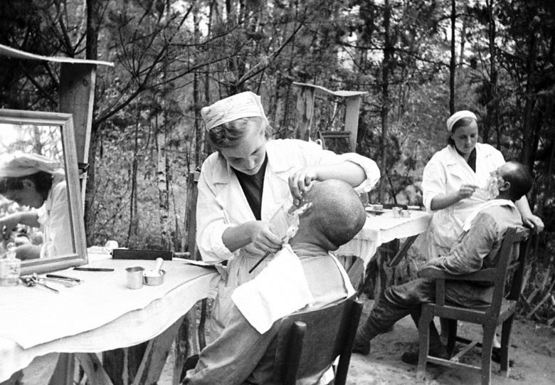 Западный фронт. Стрижка и бритье советских бойцов в прифронтовой парикмахерской. Август 1943 год.